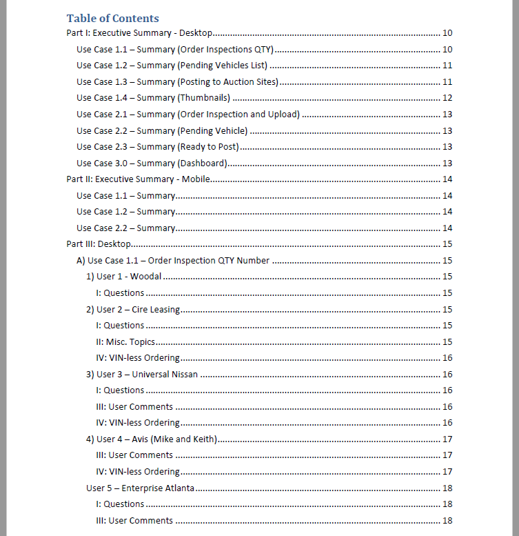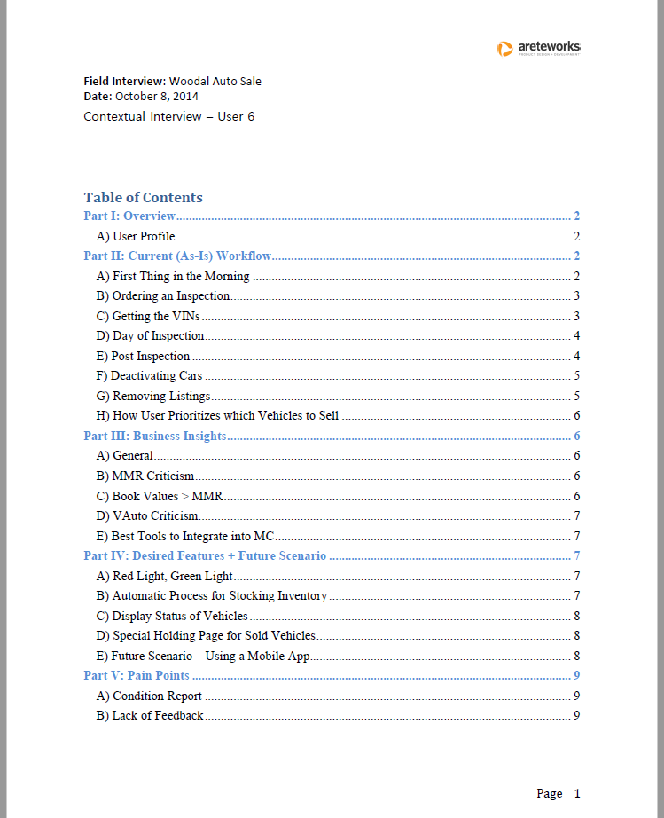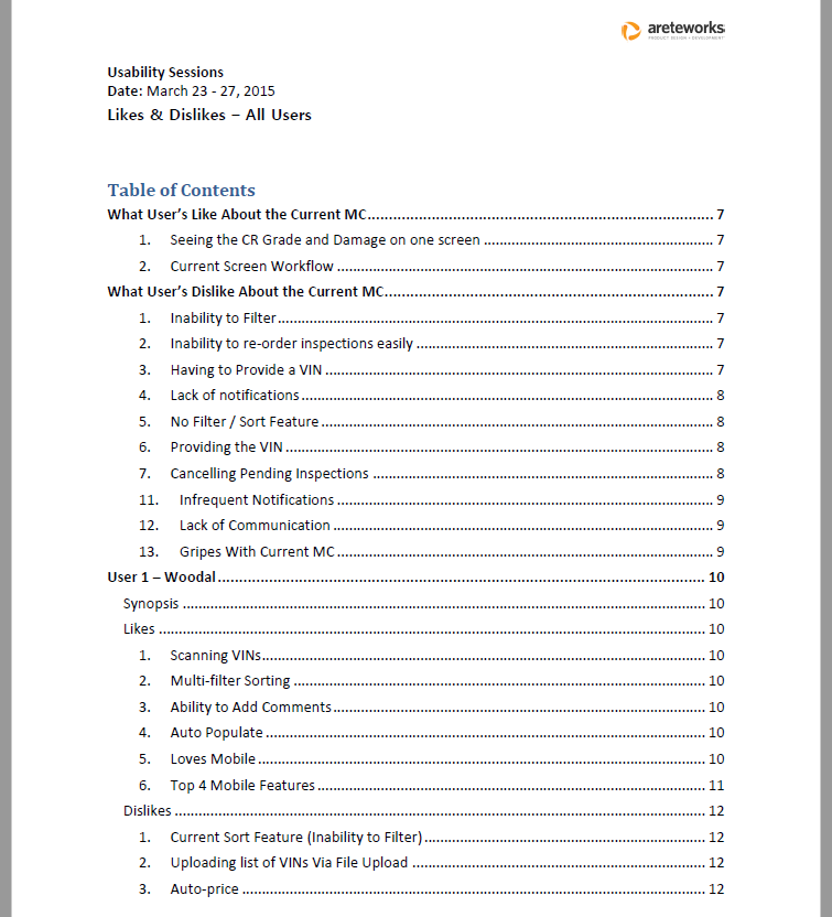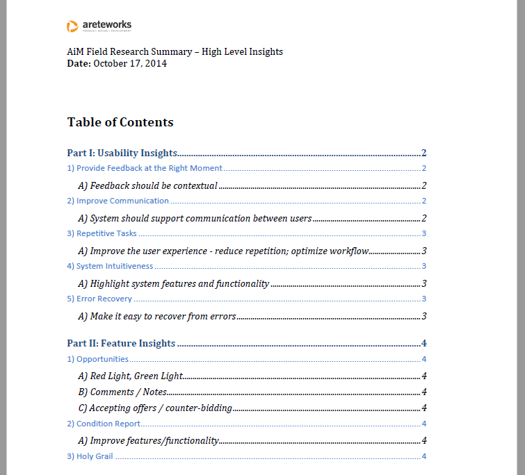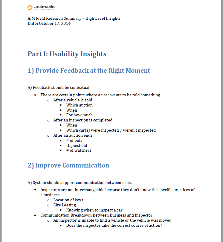 After the kick-off meeting, our team had a good idea of what AiM wanted, how their product currently worked, and how we should proceed. I consolidated my meeting notes into a 16-page document summarizing our high-level discussion points. Here’s a glimpse of what we discussed.
